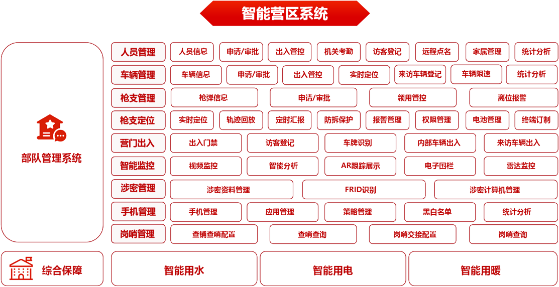 部隊管理系統 機關辦公系統 軍事教育系統 智慧政工系統 軍事訓練系統 后勤保障系統 智慧安防系統 裝備管理系統